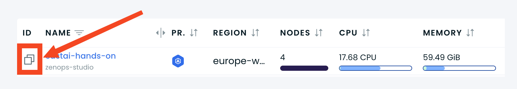 - Le cluster ID est disponible dans la console, dans la liste des clusters, première colonne.