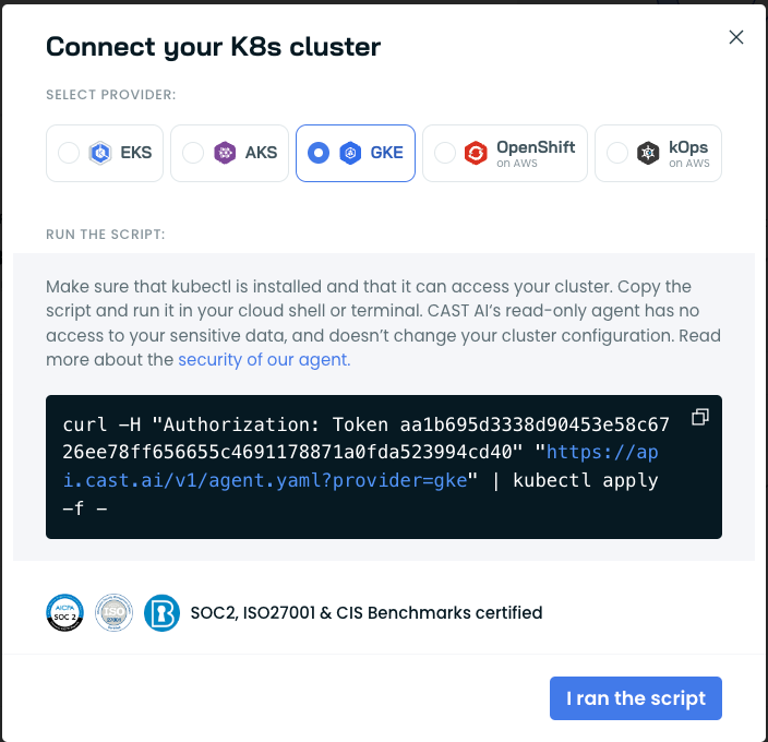 - Le déploiement d'un agent en lecture seule remontant la configuration du cluster Kubernetes à la plateforme CastAI.